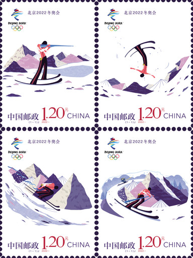 这套邮票有四枚,分别表现了越野滑雪、高山滑雪、冬季两项和自由式滑雪等冬奥会雪上运动项目。对于大多数人来说,对雪上运动的了解停留在电视上,对专业级比赛知之甚少。作为设计师,我们必须熟悉这些内容,除了邮票编辑提供的参考图片和网上能搜到的资料,还要观看每个项目的实景录像,了解比赛的基本规则和内容,在脑海中形成初步、直观的印象,这样才能把运动的独特美感表达出来。简单地说,设计好像投入和产出,首先吸收消化,然后产出,如果没有好的吸收过程,那么很难有好的产出效果。