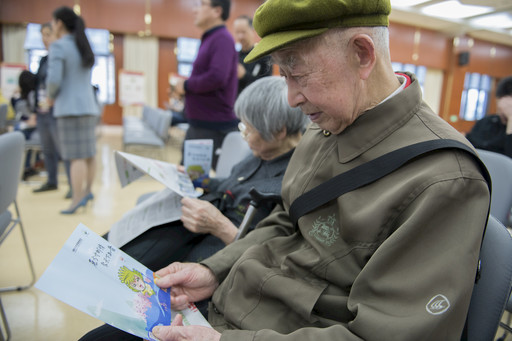 南京市民仔细阅读世界邮展宣传册。→