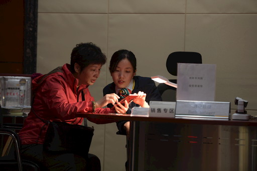 新时代的年轻员工从上一代东四邮政人手中接过接力棒,继续探索亲情服务的新内涵。图为理财经理张婷婷指导用户使用手机银行办理业务。