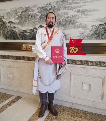 四川省甘孜藏族自治州甘孜县邮政分公司长途邮运驾驶员其美多吉荣获全国民族团结进步模范个人称号,习近平总书记亲自为其美多吉颁发奖章和证书。