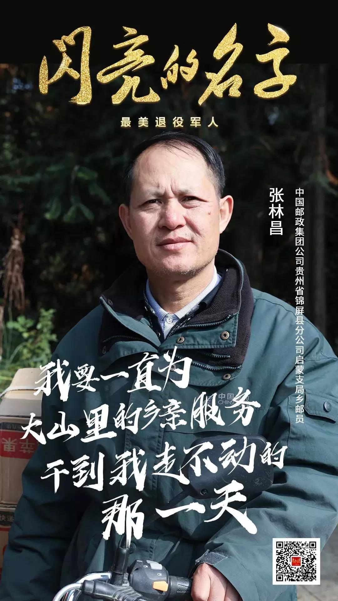 张林昌1983年入伍,1987年退役后主动申请到全县最难走的邮路送信送报,32年来坚持为偏居一隅的苗族侗族同胞投递报刊、邮件140多万件,在大山里跋涉超过24万公里,相当于走了19次“二万五千里长征”;他义务为山区群众代购农作物良种、生活用品,代取款,被群众称为“乡邮路上的天使”和“九十九道拐上的绿色使者”。他曾获全国劳动模范、第四批全国岗位学雷锋标兵、中国好人、全国模范退役军人等称号。