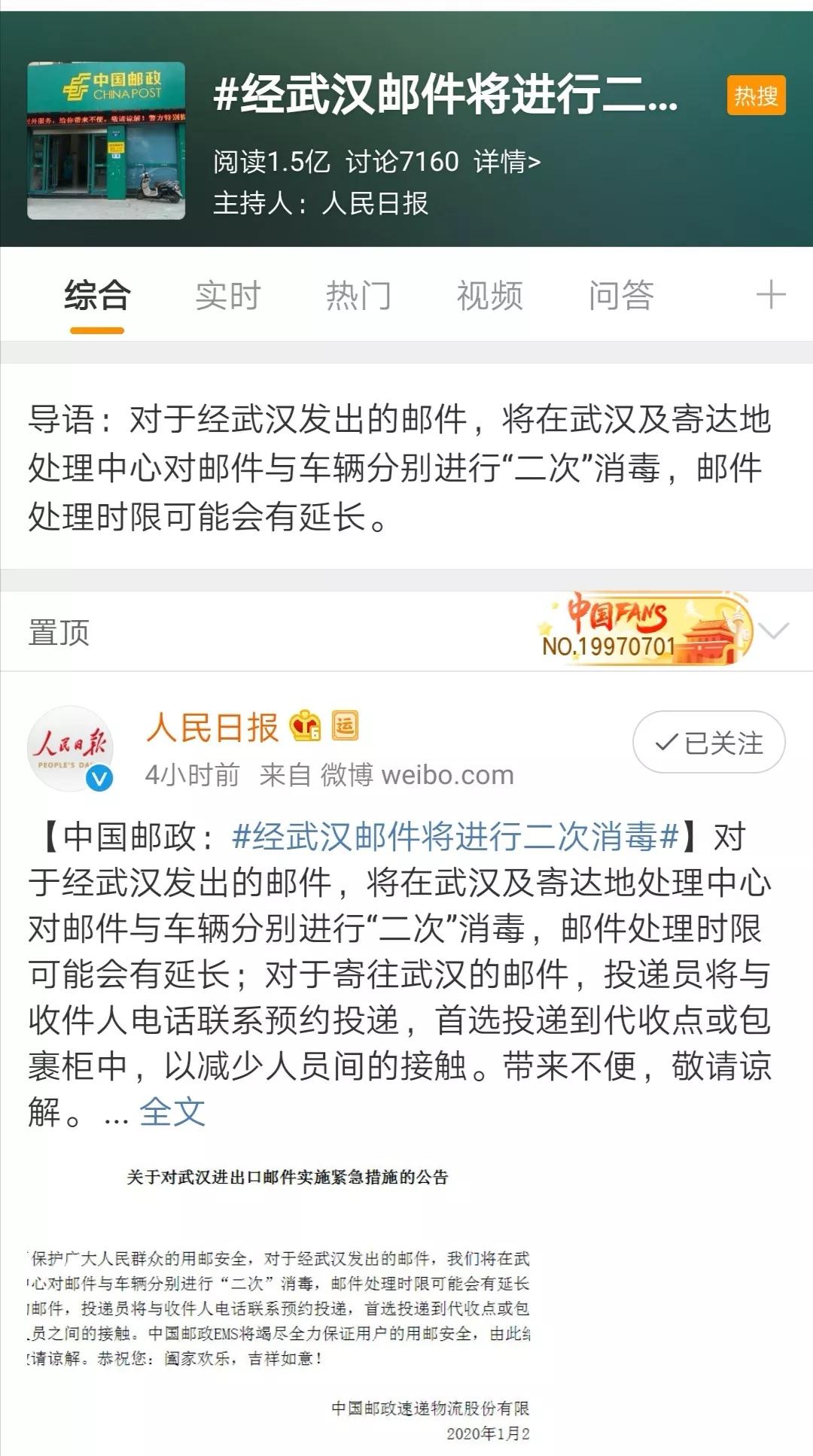 为保障用户用邮安全,经武汉发出的邮件,中国邮政在武汉及寄达地处理中心对邮件与车辆分别进行二次消毒。