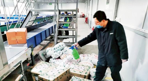 图为聊城市分公司员工给邮件消毒。