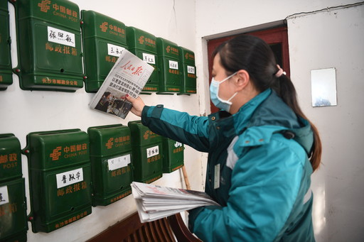 湖南省邮政分公司优化网运作业组织和生产流程,缩短投递内部作业时限,让投递员提早出班,全力以赴做好党报党刊投递工作,将党中央关于疫情防控工作的最新指示精神及时、准确传递到千家万户。湖南省分公司为投递网点配备了洗手液、消毒液、测温仪,每隔两小时对投递作业现场进行消毒,出班前、归班后对揽投车辆进行喷洒消毒;为投递人员配备了医用口罩,并在到岗和归班时进行体温检测,体温正常方可上岗。图为2月11日,长沙市分公司车站路揽投员杨望归在芙蓉区五里牌社区投递当日《人民日报》。  记者  刘园园  摄影报道
