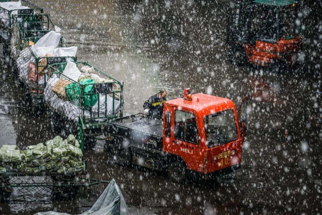 2020年2月14日上午,在位于北京站的北京邮区中心局,负责接发邮件的转运分拣员们正在风雪中紧张地转运处理封发邮件,以确保邮政通信畅通。虽在疫情当下又遇连续两日的降雪天气,但为了让捐赠物资快速寄达武汉,北京邮区中心局在分拣环节对防疫物资实施“三专”“五优”工作机制,即专人接收、专人处理、专人发运,优先收寄、优先接收、优先处理、优先运输、优先投递,并开通两个邮件接收垛口作为绿色通道,捐赠物资实行全程单独处理,内部处理环节提速两个多小时。