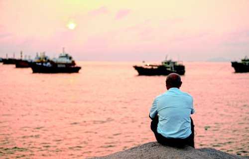 下班后,谢坚在广东珠海市外伶仃岛海边望着远方(2020年4月21日摄)。 本报记者邓华摄
