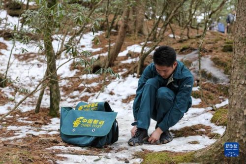 2月1日,谢菲俊在投递邮件的山路上小憩。