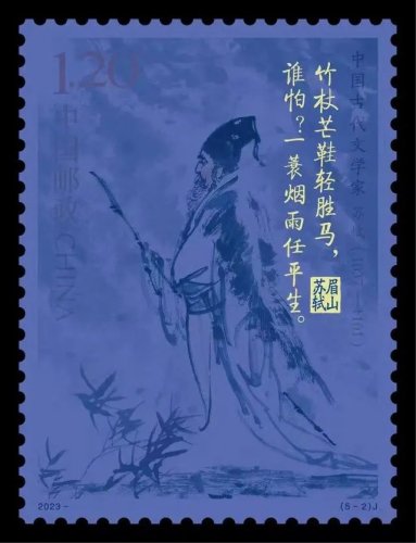 据了解,《中国古代文学家(五)》纪念邮票一套5枚,全套邮票面值6.00元。邮票计划发行数量为740.35万套,邮票图案分别为欧阳修、苏轼、李清照、陆游、辛弃疾。其中邮票第2枚就是“苏轼”。