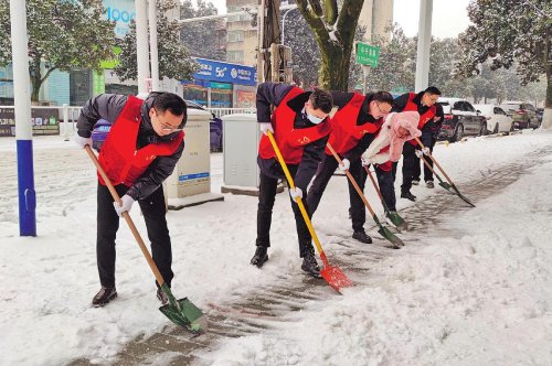 近日,位于皖西大别山腹地的安徽省霍山县一夜之间被白雪覆盖。邮储银行霍山县支行“以雪为令”,迅速组织服务队开展铲雪除冰保畅志愿活动,减少恶劣天气对群众正常生产生活秩序造成的不利影响,得到过往群众的一致好评。□安徽记者 刘昕怡 通讯员 李明 丁晓涛 摄影报道