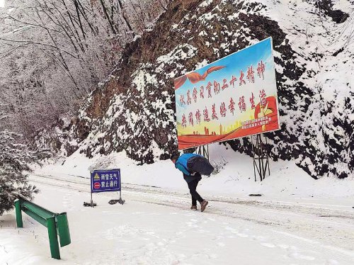 2月4日,地处鄂西北边陲的湖北口乡厚雪积压,地面结冰,湖北省十堰市郧西县邮政分公司湖北口支局投递员李善记坚持徒步进村为村民投递邮件。□周晓瑜 王嫣 摄影报道