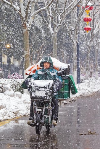 2月4日,湖北省武汉市气象台发布道路结冰橙色预警,全城一片银装素裹。全市159个投递点(含邮政支局)全部正常对外服务,邮政快递小哥顶风冒雪坚持投递,成为了冬日里一道别样的风景。□肖芳 潘芬 张斌 摄影报道