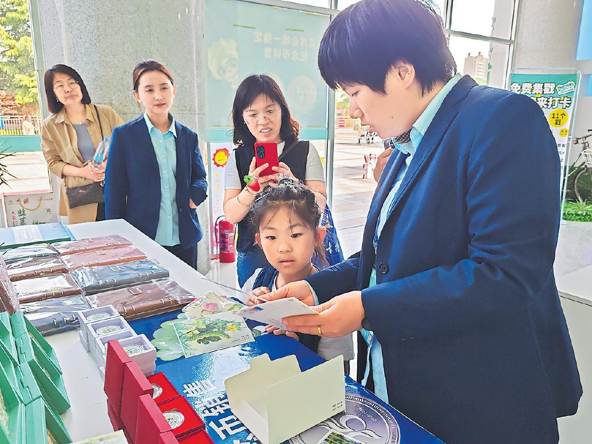 蔬菜邮局的工作人员向小朋友介绍明信片。