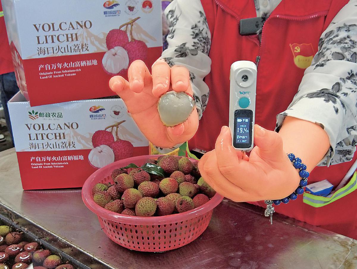 邮政工作人员测试荔枝甜度。□中国邮政报记者 黄文燕 摄