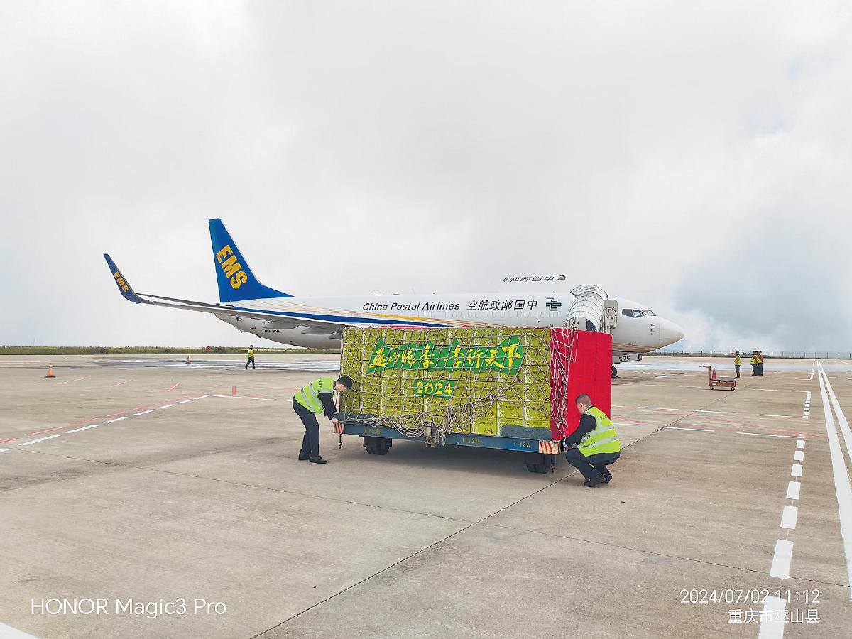 当日23时10分,装载着10710公斤巫山脆李的中国邮航CF9131航班从巫山机场起飞,75分钟后飞抵南京禄口国际机场,这标志着中国邮政2024年巫山脆李专线航班开通运行。2024年“邮运通”极速鲜邮航专机首飞,标志着重庆“邮运通”助力乡村振兴行动计划正式启动,让远在千里之外的消费者实现“今天下单,明天见李”。