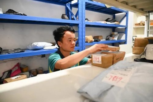 快递抵达后,超市老板商兴菊按照手机尾号把快递分拣在货架上。这家超市每天营业时间从早上六点至晚上十一点,村民在外干完农活可以随时到超市免费取快递。