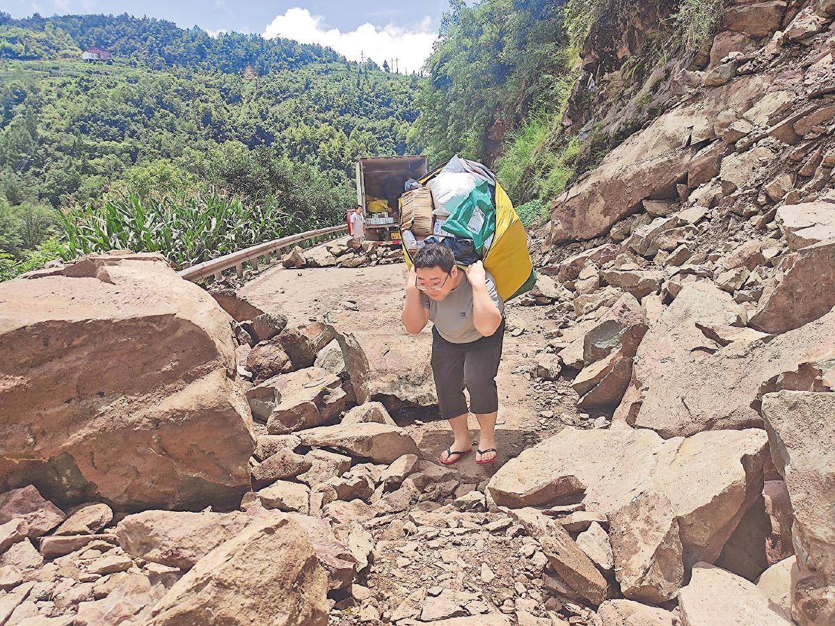 部分邮路因山体滑坡、道路塌方而中断,当地邮政组织员工背运邮件。