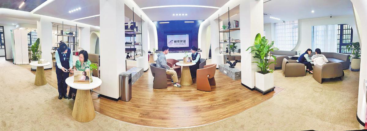 阜阳市分公司桂花苑支局财富中心员工在幽雅的环境中为客户提供专业服务。□徐雷 摄