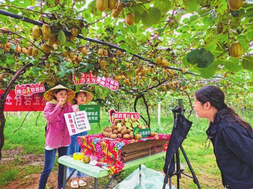 邮政直播团队在猕猴桃园开启线上直播。□刘慧芳 摄