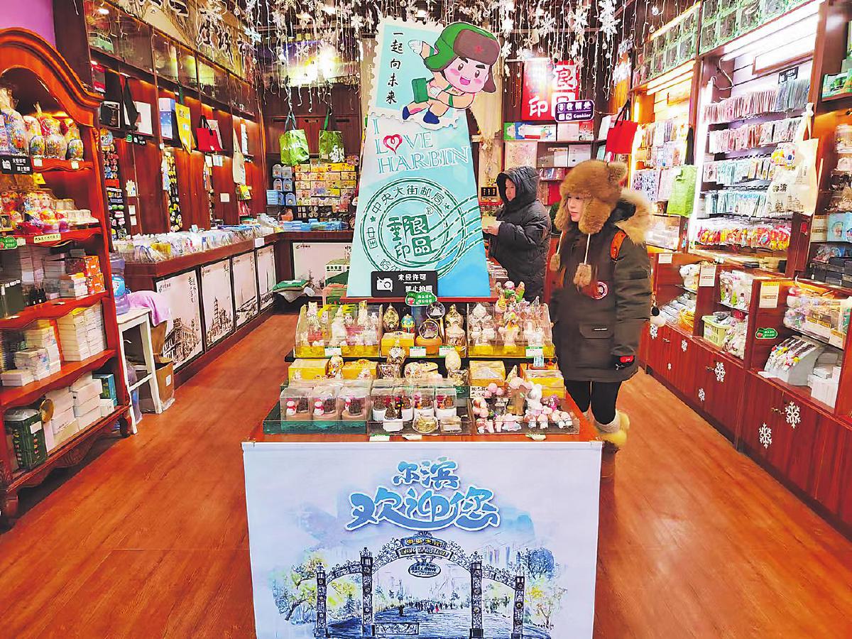 “我们是从漠河一路游玩到哈尔滨的,每到一处都要盖上几个纪念邮戳,买几样特色文创产品。中央大街邮局很有特色,纪念邮戳和明信片设计得都很漂亮。”一对小情侣开心地展示着自己收集的各地邮戳和明信片。中央大街邮局内现有文创产品500多款,仅哈尔滨主题风光明信片就有100余种。在中央大街上能看到的糖葫芦、马迭尔冰棍、东北大苞米,还有哈尔滨著名的圣·索菲亚大教堂以及其他标志性景观等,都被邮局“搬”到了屋里,成了精致可爱的文创产品。东北话徽章、栩栩如生的邮车模型等更是琳琅满目,让许多游客久久移不开眼。