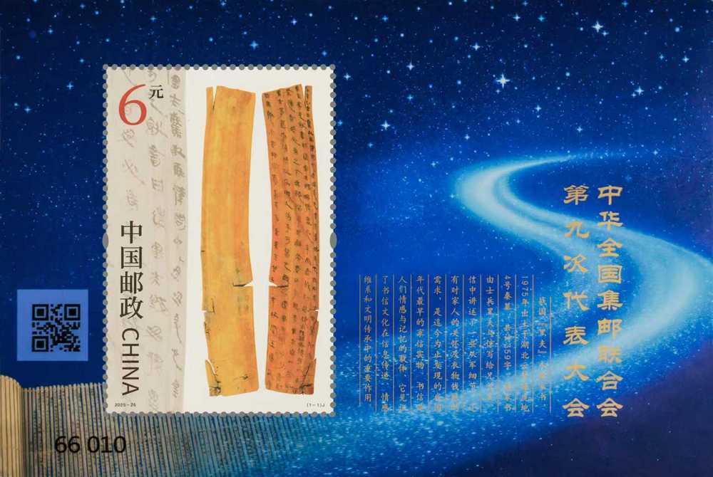 小型张图案表现了“黑夫木牍”。该木牍在1975年出土于湖北省云梦县睡虎地4号秦墓,是目前考古发现的最早家书,延续了中华全国集邮联合会大会系列邮票以邮驿文化元素为表现内容的惯例。该家书由士兵黑夫与惊写给兄长衷,信中讲述了一些从军细节,还有对家人的关怀及衣物钱粮的需求。边饰背景中展开的竹简似一条时光长河,在象征中华文明的浩瀚星空里蜿蜒伸展,穿越千年、对话古今,蕴含了中华文明在传承中创新,在创新中发展的思想智慧。