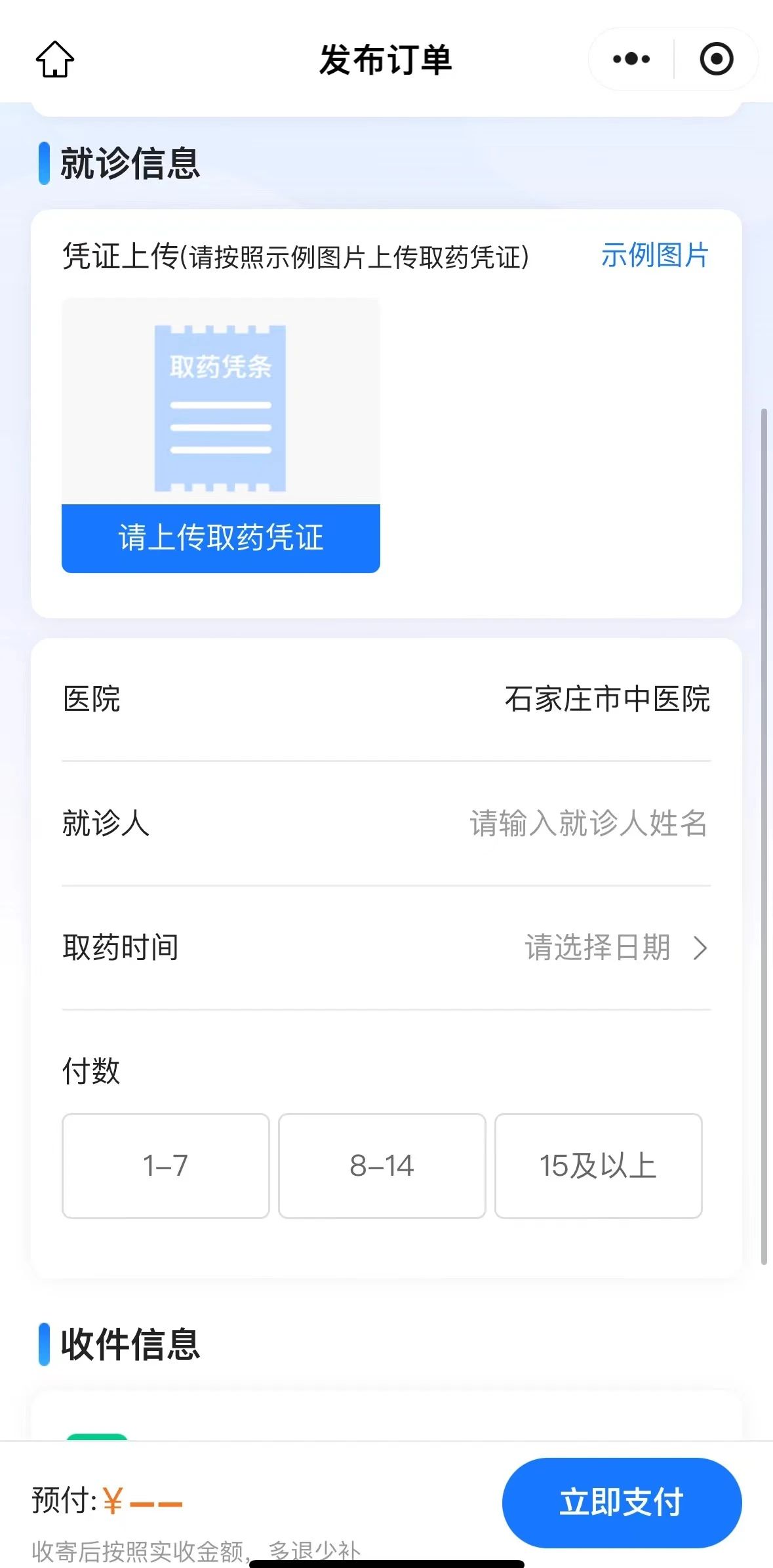 拍照上传处方笺并填写就诊信息请仔细核对姓名、病人ID、付数等信息。选择剂数。